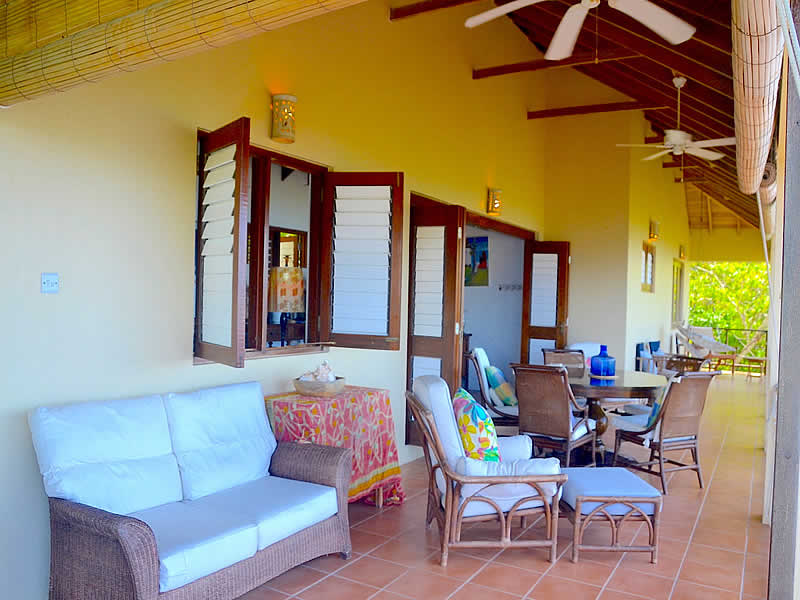 Main living space with indoor / outdoor living theme – furnishings on large covered deck. This area with panoramic views over the chain of Grenadine Islands from Mustique right down to Carriacou and Grenada on a clear day.