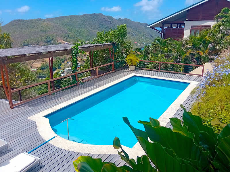 To the south and east : Facinating island views including the whole Friendship valley, and Friendship Bay, out over the uninhabited islands of Petite Nevis and Isle a Quatre, as well as the luxury private island of Mustique & the other Grenadine Islands of Canouan, Union and Carriacou on a clear day.