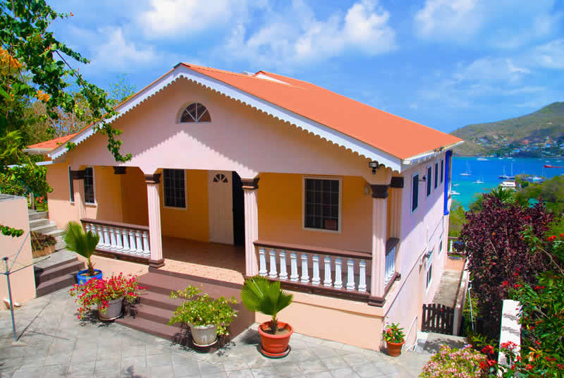 The house is of a locally built style with high, wooden beamed ceilings and wooden gingerbread fretwork. A generous terrace balcony overlooks Admiralty Bay with fantastic views.